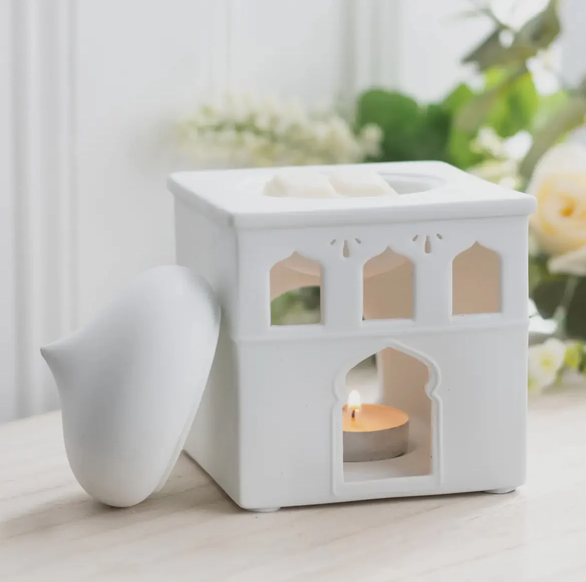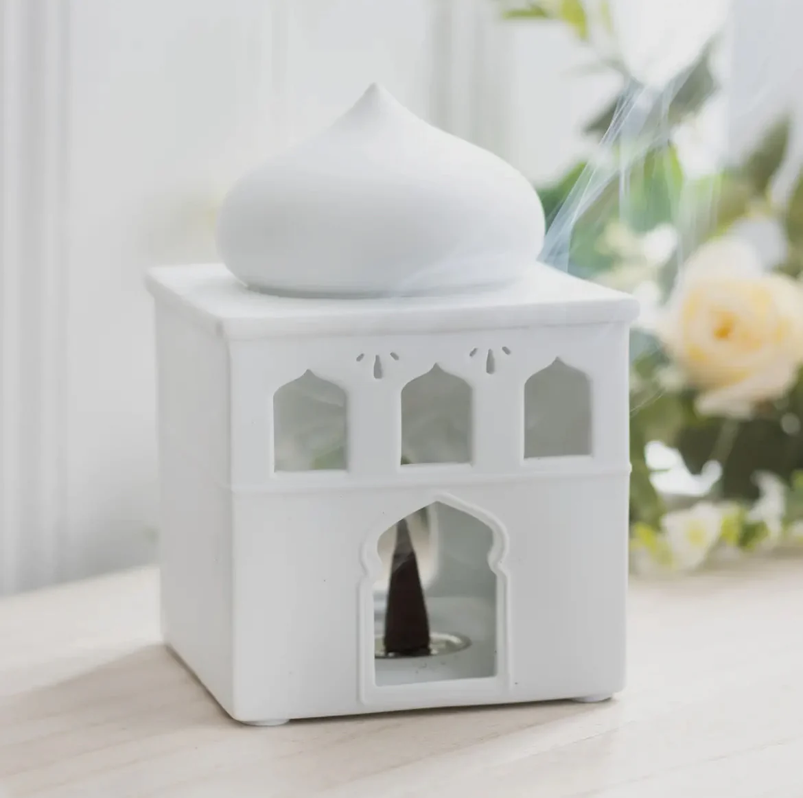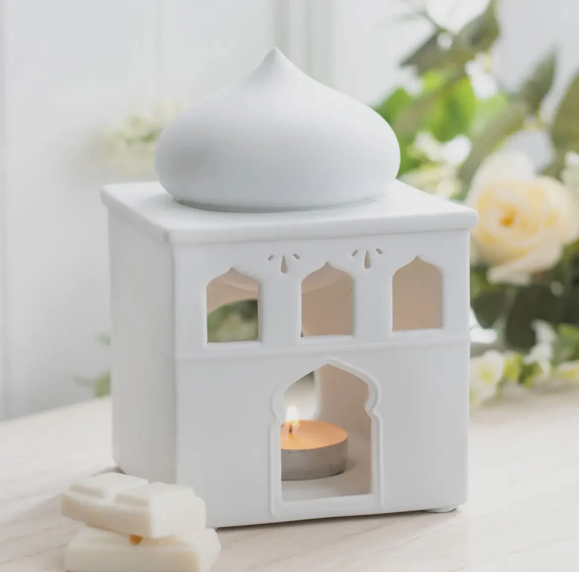 This beautiful glossy, off-white mosque burner has been carefully crafted to offer a lit-from-within glow as the windows and door are illuminated by candlelight. To use, simply place a lit tealight inside, remove the lid, add our Rose Noir and Oud wax melts, an incense cone or fragrance oil to the bowl and wait for the calming scent to fill the air. Always remove the lid whilst in use. Perfect for decorating a prayer room or for Ramadan and Eid celebrations.