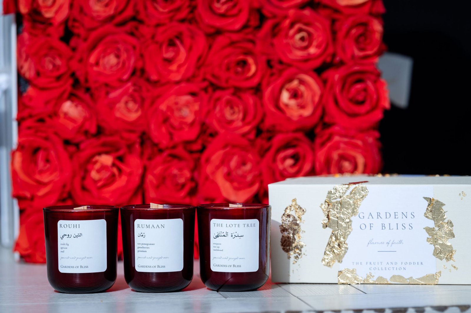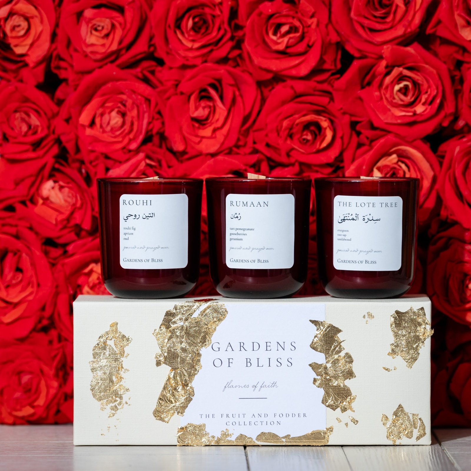 Please note: the gold leaf design on each box varies as these are handcrafted. Please choose the option to add in the gold leaf design. The maroon vessels are sold out and white matte vessels will be used. The Rumaan and The Lote Tree candles have been re-formulated. Limited quantities available.