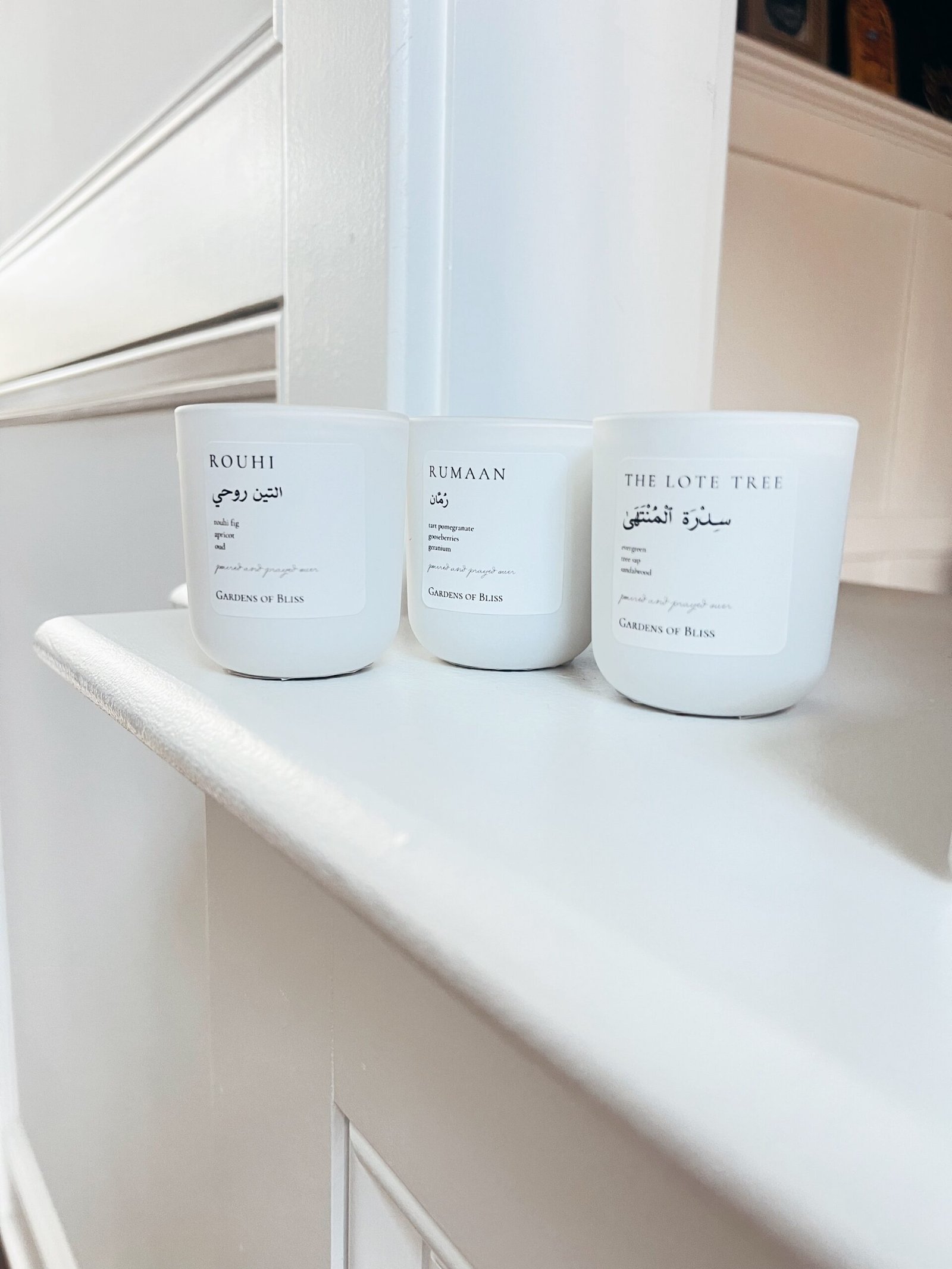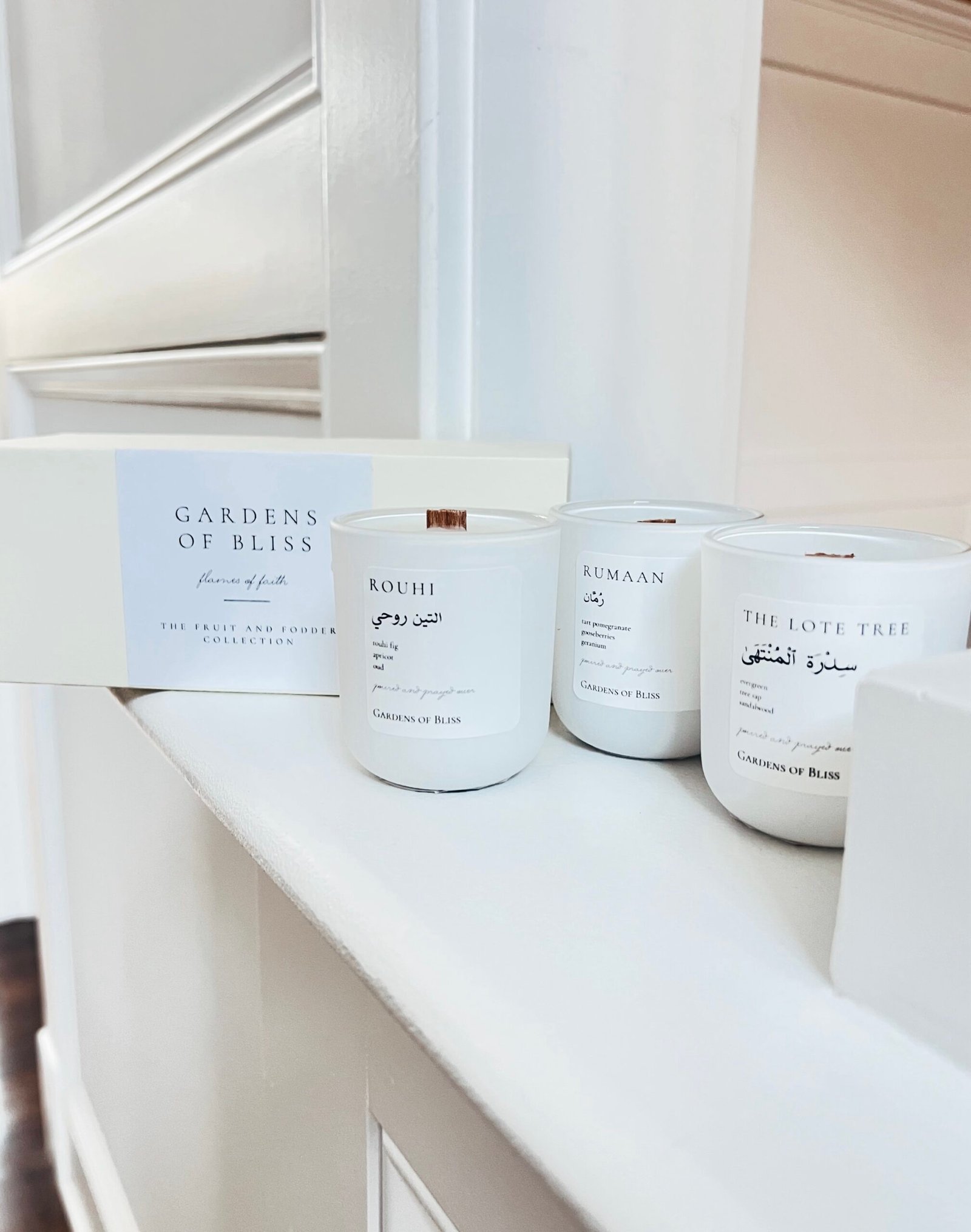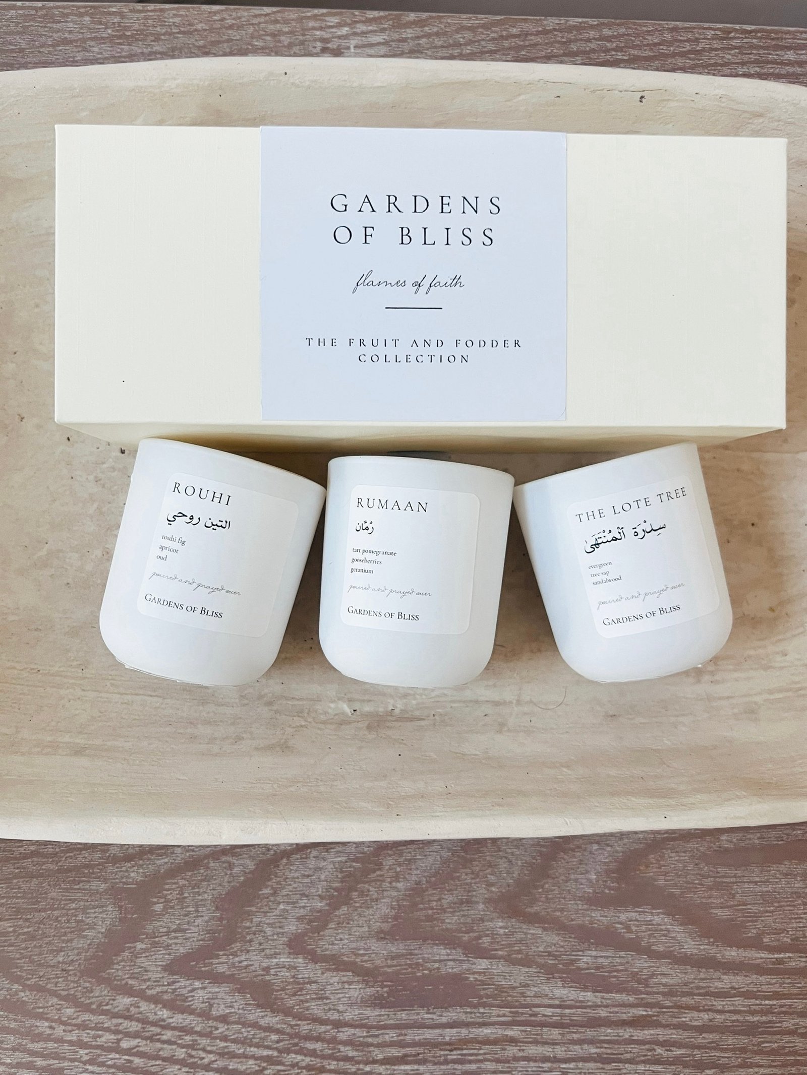 The Fruit and Fodder Collection Trio. The Rouhi, Rumaan and The Lote Tree mini candles in a cream linen gift box with the option to add in a hand crafted 24 karat gold leaf design. An elevated gift set perfect for a special occasion. All boxes are furnished with the standard matte white vessels.
